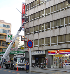 大型の自立看板・ポールサイン、突出し看板(袖看板)の場合、敷地内での作業が難しい場合、公道にクレーン車や高所作業車を設置しての作業になることが多いです。その際は、道路使用許可申請、誘導警備員の配置、主要道路については道路規制の案内看板などの設置が必要になり費用必要になります。